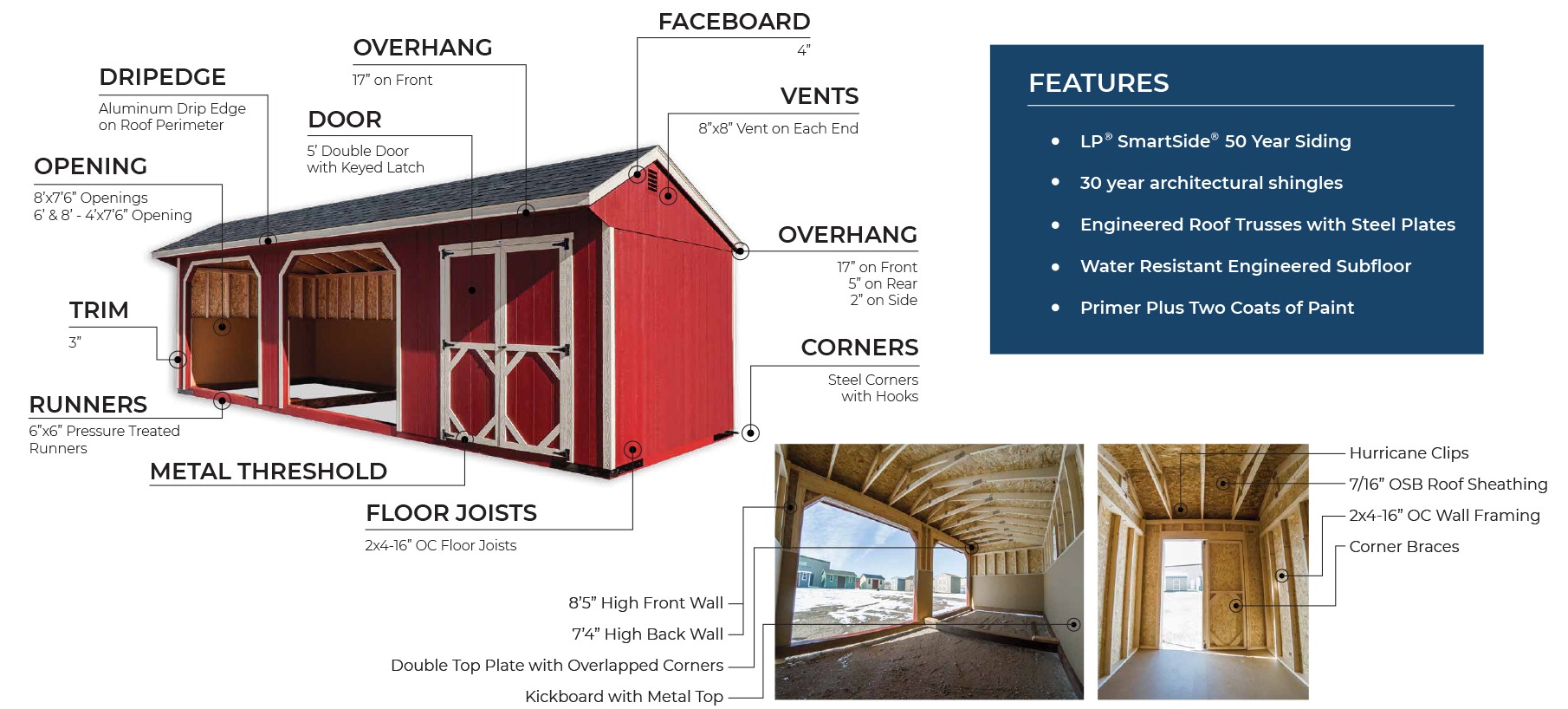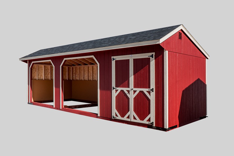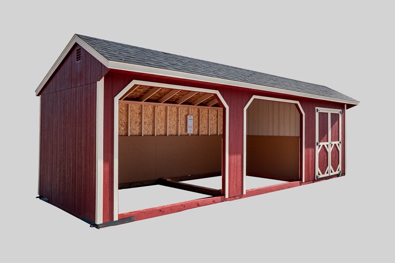 With kick boards to protect the walls, horizontal drip edges to discourage chewing, a wooden roof that is quieter during storms, and an optional tack room, this shelter is designed with your animal’s comfort in mind.