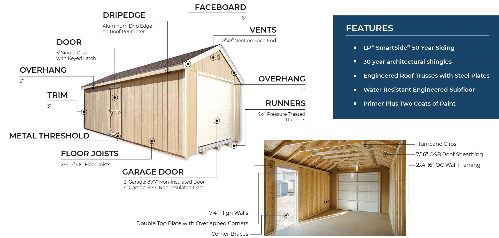 Create the perfect space for your cars, bikes, ATVs, and more! With lockable front and side doors, your toys will be safe and sound. Space for all the things you love, right on property. With a sloped entrance design, you can use a ramp or gravel to drive your vehicles straight in.